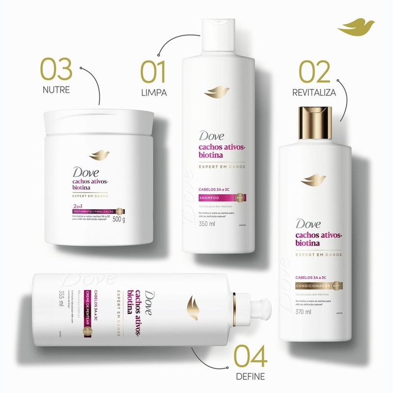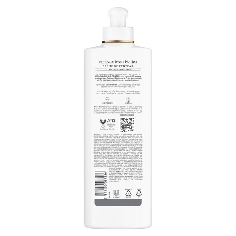 Dove creme de pentear para cabelos cacheados conta com a tecnologia patenteada Cachos Ativos + Biotina e Bio-Protein que repara, regenera e protege a cutícula