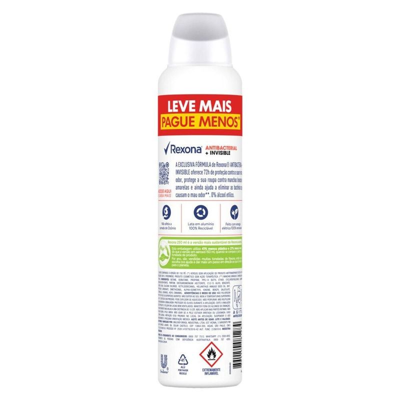 • O Desodorante Antitranspirante Aerosol Feminino Rexona Antibacterial+Invisible possui nova fórmula: 72 horas de proteção contra a transpiração e o mau odor, ativada pelo movimento • O novo desodorante feminino Rexona responde diretamente ao seu movimento, mantendo você seca, fresca e protegida como nunca • A tecnologia do Desodorante Antitranspirante Aerosol Feminino Rexona Antibacterial+Invisible protege a roupa contra manchas brancas e amarelas e ajuda a eliminar as bactérias que causam o mau odor • A fórmula do Antitranspirante Aerosol Feminino Rexona Antibacterial+Invisible é 0% álcool* • Agite antes de usar. Aplicar o Desodorante Feminino Rexona Antibacterial+Invisible somente nas axilas a não menos de 15 cm da pele • Este desodorante antitranspirante não afeta a camada de ozônio, possui lata em alumínio 100% reciclável e é feito com energia elétrica 100% renovável Mais uma vez Rexona se supera e relança sua linha de desodorantes com uma fórmula inovadora, que combina um novo e exclusivo ativo antitranspirante com a tecnologia de fragrâncias encapsuladas. O resultado? O Desodorante Antitranspirante Aerosol Feminino Rexona Antibacterial+Invisible garante 72 horas de proteção ativada pelo seu movimento e muito mais confiança para você encarar qualquer desafio. Com o registro de 16 patentes e mais de 300 testes técnicos, está comprovado que essa nova tecnologia antitranspirante entrega um nível de proteção contra o suor como nenhuma outra proposta regular já entregou antes. A nova e exclusiva fórmula de Rexona Antibacterial+Invisible trabalha com um sistema de partículas menores e mais estáveis, que formam uma barreira protetora mais resistente e duradoura contra a transpiração e o mau odor, mantendo você seca, fresca e protegida a cada novo movimento e por muito mais tempo. Sua tecnologia protege a roupa contra manchas brancas e amarelas e ajuda a eliminar as bactérias que causam o mau odor. Este desodorante feminino antitranspirante não afeta a camada de ozônio, possui lata em alumínio 100% reciclável e é feito com energia elétrica 100% renovável. Modo de usar: Agite antes de usar. Aplicar somente nas axilas a não menos de 15 cm da pele. Sua fórmula é 0% álcool*. Além da nova fórmula, o novo formato de Rexona aerosol 250 ml é mais econômico, onde você leva mais produto e paga menos**. Ele é o formato mais sustentável de Rexona aerosol, com uma embalagem que utiliza 23% menos metal e 41% menos plástico do que a versão de aerosol 150 ml, quando se compara o gasto por tonelada de produto. Por ano, são vendidas muitas toneladas de Rexona aerosol, então essa escolha nos ajuda a dar mais um passo em direção ao que é melhor para o planeta. Por que Rexona não te abandona. *Não contém álcool etílico. **Quando comparado à versão de 150 ml