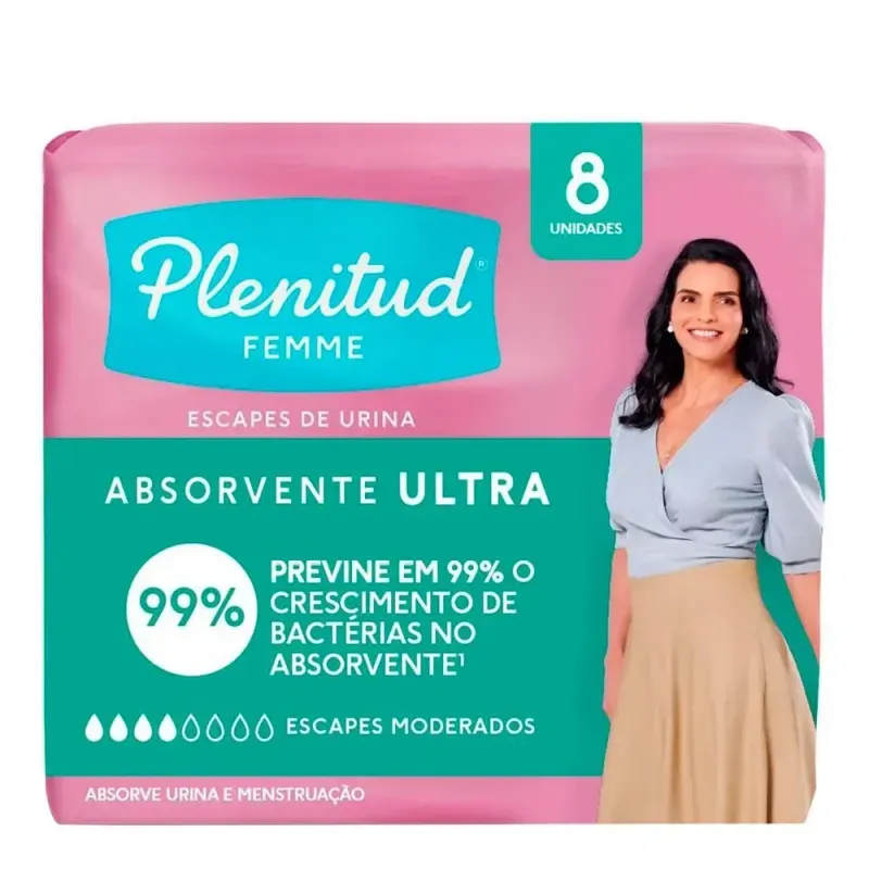 O absorvente Plenitud Ultra foi desenvolvido para proporcionar conforto, segurança e discrição a quem convive com incontinência urinária. Com um formato anatômico e discreto, ele conta com uma tecnologia avançada que ajuda a neutralizar odores indesejados, além de oferecer excelente absorção, mantendo a pele seca por mais tempo. A embalagem contém 8 unidades, embaladas individualmente para maior praticidade e higiene. Para conservar o produto em boas condições, recomenda-se armazená-lo em local seco, fresco, arejado e longe da luz solar direta, sempre fora do alcance de crianças. É indicado para casos de incontinência leve a moderada e deve ser fixado diretamente na calcinha, após a remoção da fita central. É fabricado com materiais atóxicos, garantindo segurança e qualidade.