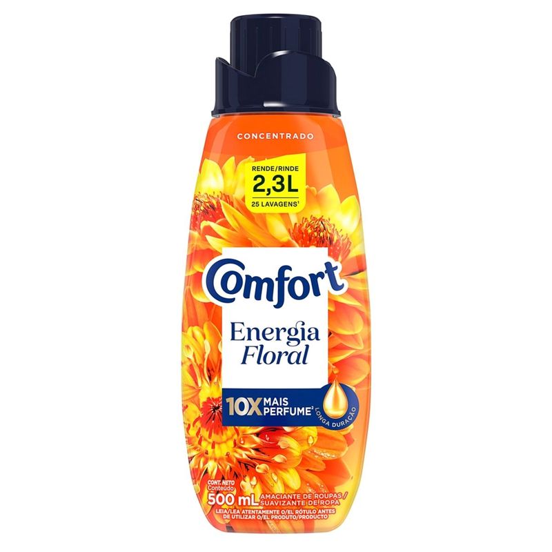 • O amaciante de roupas Comfort tem 10x mais perfume** de longa duração, que deixa suas roupas perfumadas por muito mais tempo • O Amaciante Concentrado Comfort Energia Floral tem ótimo rendimento, menos de meia tampinha basta na sua lavagem*! Rende 2,3 Litros e 25 lavagens* • O Amaciante Concentrado Comfort Energia Floral possui óleo de argan*****, que cuida intensamente das suas roupas enquanto as perfuma por muito tempo • Esse amaciante de roupa possui cápsulas de perfume para roupas que blindam contra o mau odor**** e perfumam sua lavanderia • Comfort previne suas peças dos danos da lavagem de roupa, mantendo as cores*** dos tecidos vibrantes e evitando a formação de bolinhas*** e esgarçamento*** • Comfort pensa nas suas roupas e no meio ambiente! Além de ser concentrado, sua garrafa e tampa são feitas de plástico 100% reciclado e reciclável. O Amaciante Concentrado Comfort Energia Floral tem 10x mais perfume** de longa duração, por isso deixa suas roupas perfumadas por muito mais tempo. Sua formulação incrível possui cápsulas de perfume que são liberadas durante a lavagem para deixar uma fragrância duradoura nas suas roupas e blindar o tecido contra o mau odor****. O amaciante de roupa Comfort concentrado possui perfume encapsulado que penetra no tecido durante o processo de lavagem, deixando sua roupa muito mais cheirosa até mesmo depois de seca! O motivo? Quando você se movimenta, essas cápsulas de perfume para roupas se rompem e liberam essa fragrância incrível, fazendo com que aquele cheirinho de roupa lavada dure muito mais! Além disso, sua fórmula contém óleo de argan*****, um óleo natural com alto potencial nutritivo, que perfuma e trata suas roupas, prevenindo os danos da lavagem, mantendo as cores*** do tecido vibrantes por mais tempo, evitando a formação de bolinhas*** e esgarçamento***. Comfort te oferece tudo isso com um ótimo rendimento, por ser concentrado, menos de meia tampinha basta* rende muito! Além de cuidar e perfumar suas roupas, o amaciante concentrado Comfort cuida do meio ambiente, sua garrafa e tampa são feitas com plástico 100% reciclado e reciclável. O Amaciante Concentrado Energia Floral cuida das suas roupas, pois possui ingredientes capazes de alinhar e proteger o tecido, reduzindo o atrito entre as fibras durante o processo de lavagem, evitando futuros danos nas peças. *Considerando recomendação de dosagem para máquinas até 8 kg (20 ml). **Teste analítico com 22,5 ml de produto comparado com marca diluída, sem perfume encapsulado do mesmo fabricante. ***Benefícios de tratamento do amaciante obtidos versus roupas lavadas sem amaciante. ****Baseado em testes realizados com odores representativos. *****Com óleo de argan na composição da fragrância.