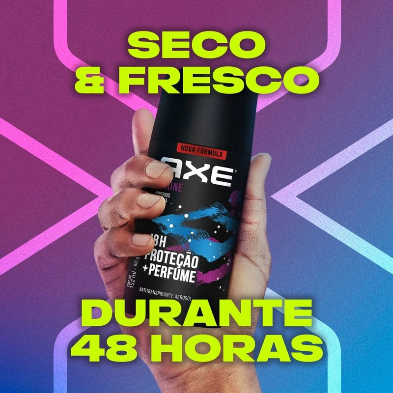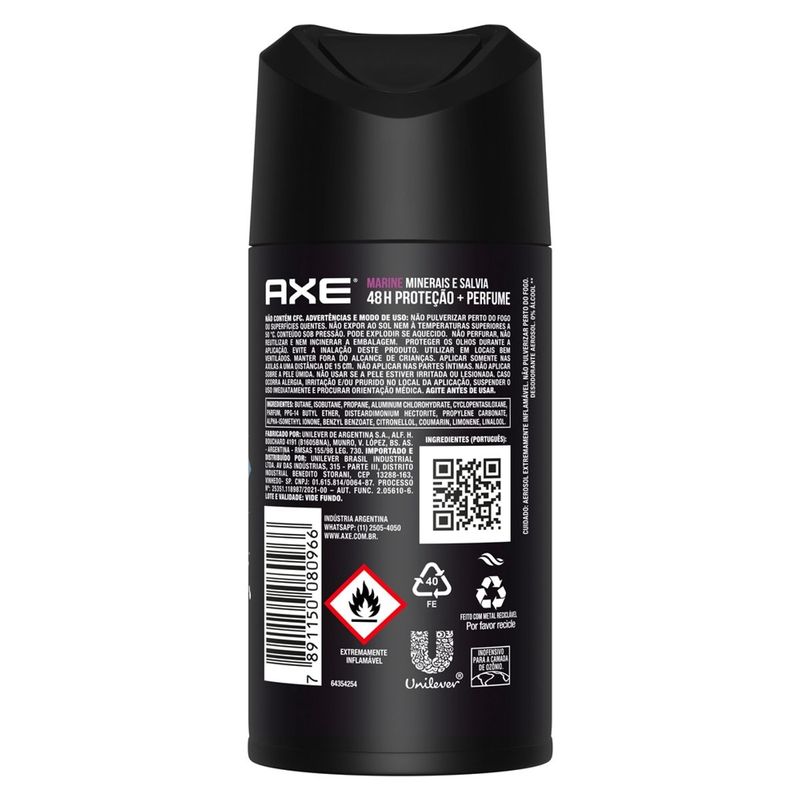 A nova fórmula do Antitranspirante Aerosol Axe Marine que te vai manter protegido e fresco o dia inteiro Antitranspirante desodorante aerosol que além de deixar um perfume irresistível, te mantém protegido contra o mau odor por até 48h A fragrância deste antitranspirante reúne a refrescante combinação de minerais e salvia para um sensação de frescor e proteção de longa duração contra o mau odor. É também formulado com 0% álcool* Agite bem o antitranspirante Axe Marine antes de cada uso, aplique somente nas axilas a uma distância de 15 cm e sinta a diferença! Este antitranspirante aerosol Axe vem com um novo design numa embalagem feita com metal reciclável, por favor recicle ela também Enfrete os desafios do dia a dia com o máximo de frescor e confiança que o antitranspirante Axe Marine te oferece, com o perfume que você já conhece e máxima proteção, todos os dias! Com a nova fórmula do Antitranspirante Aerosol Axe Marine, feita com uma mistura perfeita e refrescante de minerais e salvia, você se sentirá mais incrível, fresco e protegido todo o dia. Sua fórmula com 0% álcool* garante proteção contra o mau odor por até 48h e possui um perfume irresistível para uma sensação de frescor que dura o dia inteiro. Para aplicar, agite bem o antitranspirante Axe Marine antes de cada uso, aplique somente nas axilas a uma distância de 15 cm e sinta a diferença! A fragrância minerais e salvia te deixa totalmente fresco e 100% pronto para o que quer que você faça. A lata do antitranspirante Aerosol Axe Marine vem com um novo design numa embalagem com metal infinitamente reciclável, e para manter este ciclo, por favor recicle também ela! Não contém CFC, sendo inofensivo para a camada de Ozônio. Não importa o que aconteça, você está pronto, mais fresco e o planeta mais limpo. Axe foi criada para ajudar você a ser o seu melhor, tanto no trabalho como na sua vida pessoal. É um desodorante de longa duração, o que significa que você ficará perfumado ao longo do dia, mantendo o seu estilo e a sua confiança. Experimente também outras fragrâncias dos antitranspirantes Axe. Cuidado: aerosol extremante inflamável. Não pulverizar perto do fogo. *Não contém álcool etílico.