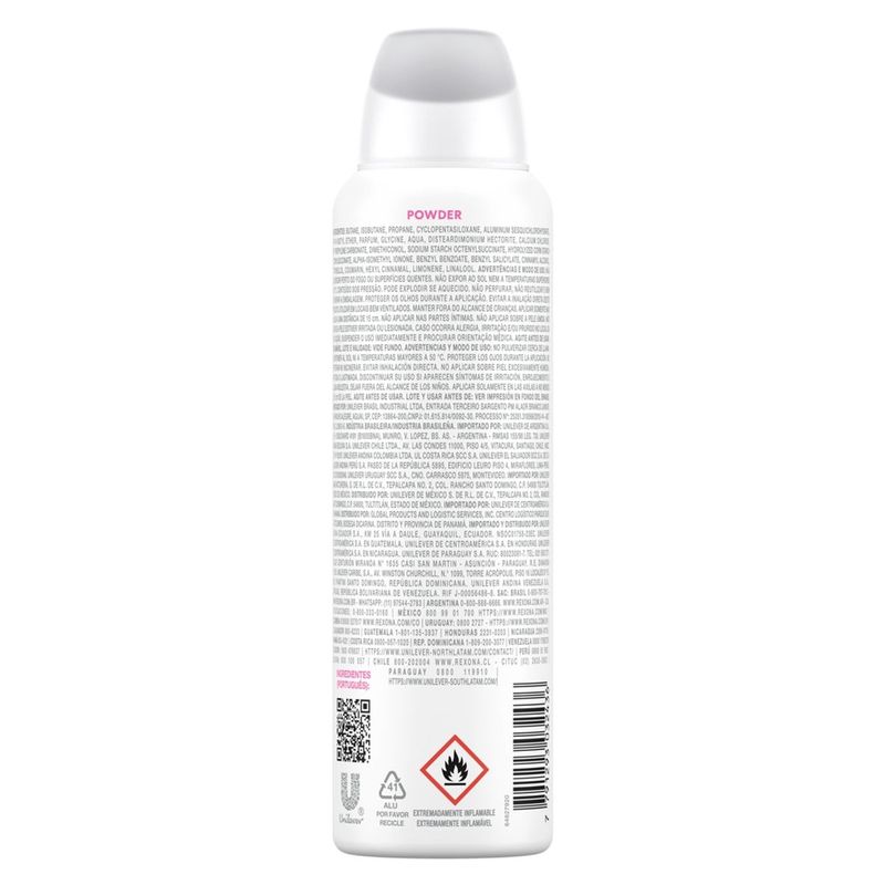Conheça o novo Desodorante Antitranspirante Aerosol Rexona Powder Dry, desenvolvido para garantir controle inteligente do suor e do mau odor. Com tecnologia que se ativa com o calor do seu corpo, ele oferece 72 horas de proteção contínua, adaptando-se ao seu ritmo e às condições da sua pele para manter você seca, fresca e confiante ao longo do dia. Sua fórmula avançada foi desenhada para se adaptar às condições das axilas, a fim de proporcionar um controle altamente eficiente do suor e do odor por 72h. Atua em sincronia com a resposta natural do suor do corpo para fornecer controle eficaz de umidade, adaptando-se ao pH do corpo para formar uma barreira que combate o suor. A prevenção do suor prejudica o crescimento de bactérias causadoras de odores, o que leva a um controle eficaz do odor, mesmo nos momentos mais intensos. Sua formulação possui 0% de álcool etílico. Sua fragrância possui uma combinação única de jasmim e baunilha, garantindo a sensação de frescor durante o dia inteiro. Para melhores resultados, agite bem antes de usar e aplique nas axilas secas a uma distância de 15 cm. Este desodorante antitranspirante não afeta a camada de ozônio, possui lata em alumínio 100% reciclável e é feito com energia elétrica 100% renovável.