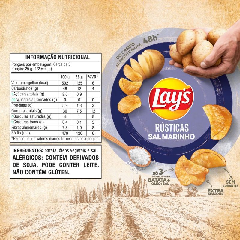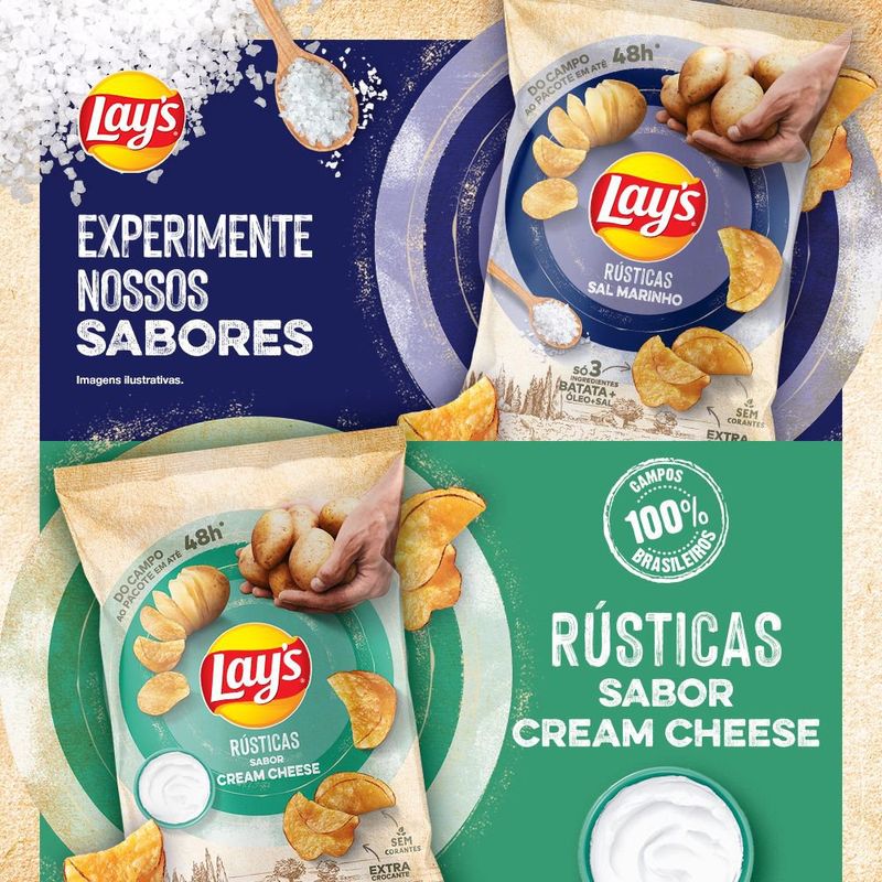Chegou LAY’S® Rústicas, a nova linha de LAY’S®, marca nº1 de batatas chips do mundo! LAY’S® Rústicas te apresenta um novo tipo de batata: extra crocantes, com casca e corte grosso, nos deliciosos sabores Sal Marinho e Cream Cheese. Não deixe de experimentar a batata extra crocante que vai do campo ao pacote em até 48 horas*.