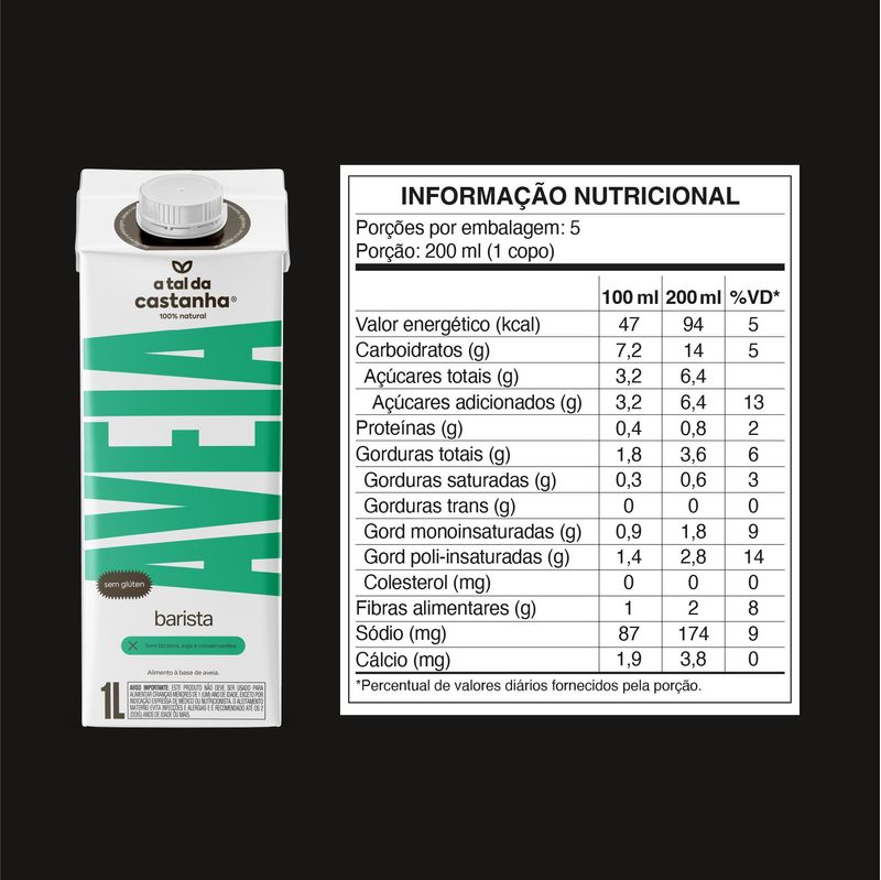 A bebida base aveia A Tal da Castanha é apresentada em embalagem de 1 litro, ideal para o consumo familiar. É importante ressaltar que o produto deve ser mantido refrigerado após aberto e consumido em até 3 dias para garantir sua frescura e sabor. Com ingredientes selecionados, a bebida não contém adição de açúcares, preservando o sabor natural dos ingredientes.