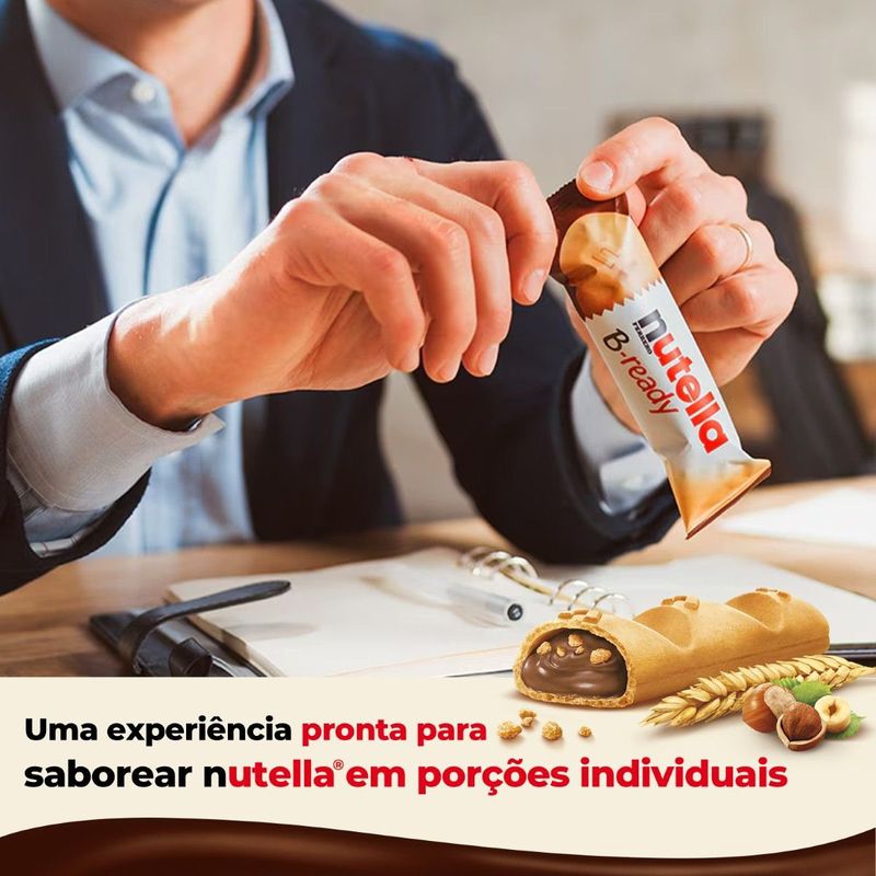 Apresentando Nutella® B-ready, a opção pronta para saborear de Nutella®! Aproveite o sabor único de Nutella® envolto por um wafer leve e crocante. Crocante por fora. Cremoso por dentro. Uma deliciosa casquinha de wafer crocante recheada com Nutella® e com flocos crocantes de trigo. Nutella® B-ready é a maneira mais prática de aproveitar o sabor único Nutella® em uma combinação deliciosa de texturas! *Imagens meramente ilustrativas*
