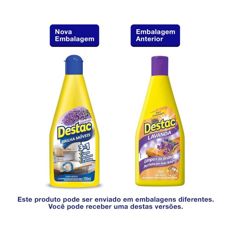 Destac Brilha Móveis Lavanda limpa, perfuma, dá brilho e protege seus móveis já no primeiro uso. Sua exclusiva fórmula com silicone forma uma película de proteção em vidros, espelhos, revestimentos de parede, madeira e estofados de couro.