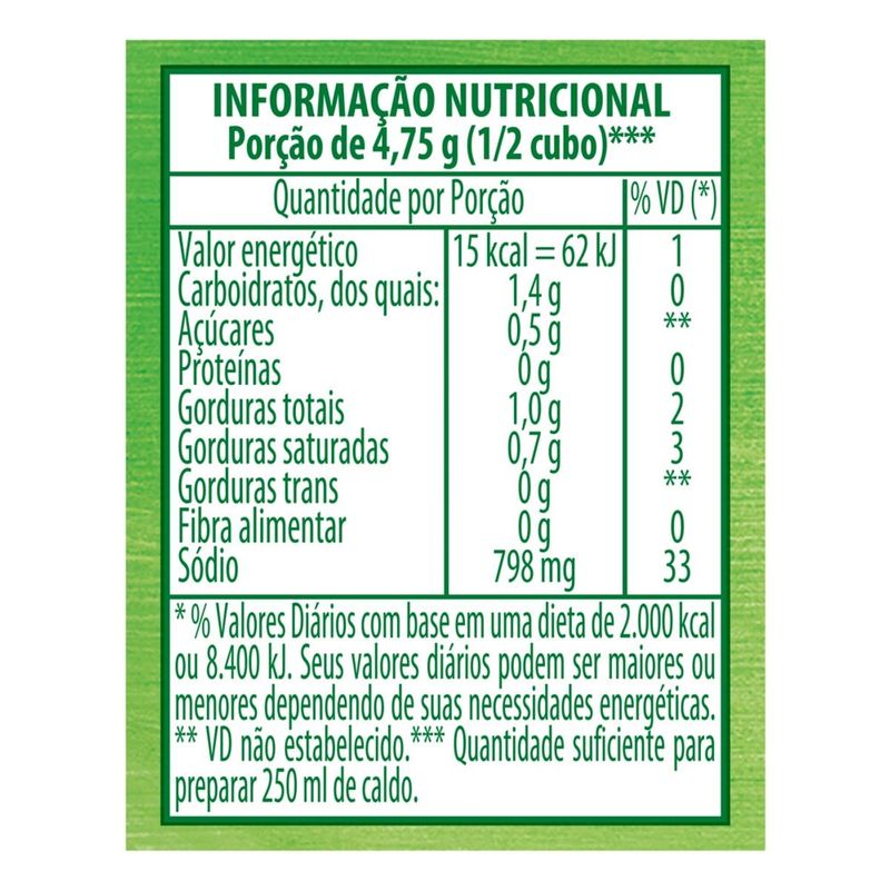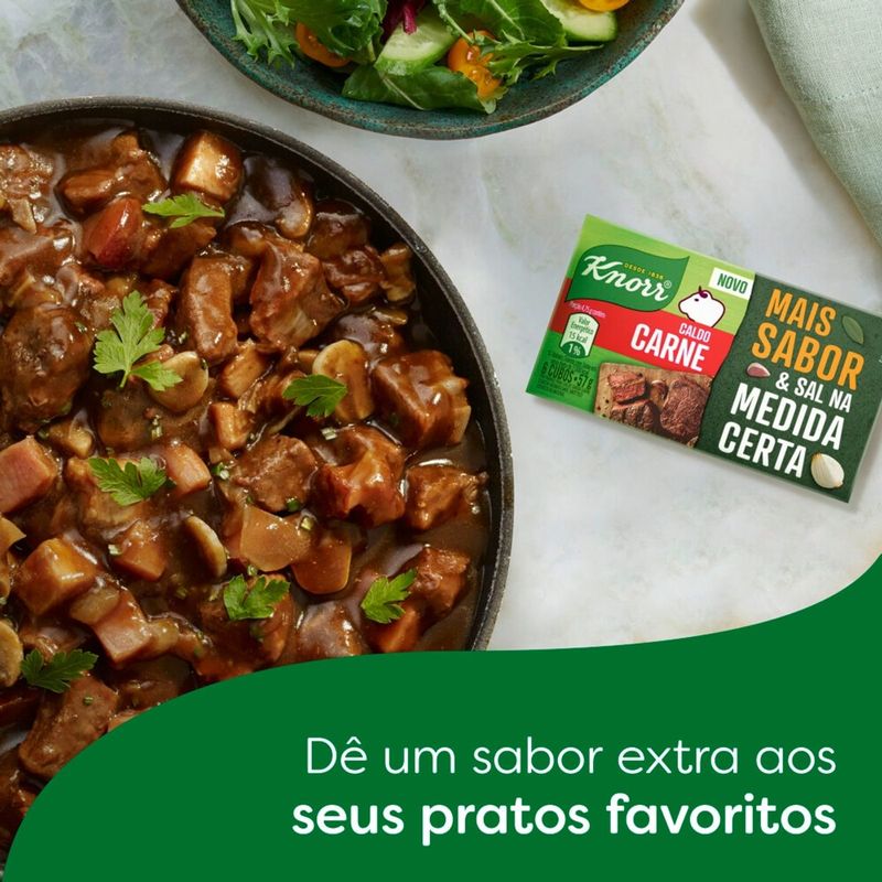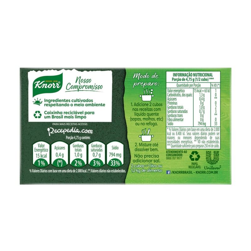 • O Caldo Knorr Carne traz mais sabor às suas receitas, com ervas e especiarias cuidadosamente selecionadas, e sal na medida certa! • Cubos feitos com ingredientes naturais como alho, louro, pimenta vermelha, salsa, concentrado natural de cebola e cúrcuma • Garanta mais sabor ao seu prato! Para isso, utilize 1 cubo de Caldo Carne para 600 g de alimento ou 500 ml, em preparações com líquido quente ou na refoga • O caldo Knorr é feito com ingredientes selecionados que dão mais sabor aos seus pratos para uma dieta balanceada e saborosa • Os cubos de caldo contém sal na medida certa e ingredientes naturais, que dão mais sabor e cor às suas receitas. Não precisa adicionar sal! • Os caldos Knorr são bons para você e para o planeta: possuem ingredientes cultivados respeitando o meio ambiente e caixinha 100% reciclável Caldo Knorr Carne traz mais sabor e cor às suas receitas, deixando seu prato com um tempero ainda mais especial! Estes cubos de caldo são feitos com sal na medida certa, e com ervas e especiarias cuidadosamente selecionadas, como alho, louro, pimenta vermelha, salsa, concentrado natural de cebola e cúrcuma. A seleção minuciosa de ingredientes é o primeiro passo para a criação dos produtos Knorr e a preservação do sabor das ervas e vegetais, tratados com tanto carinho desde as fazendas até a nossa fábrica, é resultado do processo de desidratação, um sistema simples e seguro para retirada de água dos alimentos. Esta é uma metodologia bastante antiga, que serve como alternativa à aplicação de conservantes e indica o uso de ingredientes de verdade! Além disso, o produto é extremamente versátil e muito fácil de ser usado: utilize 1 cubo de caldo Knorr para cada 600 g de alimento ou 500ml de líquido quente, misture bem até dissolver e pronto! Não precisa adicionar sal: os produtos foram desenvolvidos para ajudar o seu dia a dia na cozinha e sua receita já contará com todo o sabor e aroma de Knorr, com o sal na medida. O nosso caldo é perfeito para temperar carne! Que tal preparar uma deliciosa lasanha à bolonhesa ou uma carne ensopada com o Caldo Carne? Os Caldos Knorr são bons para você e bons para o planeta, uma vez que possuem ingredientes cultivados respeitando o meio ambiente, embalagem reciclável e são produzidos em uma fábrica com zero emissão de gás carbônico! Conheça toda a nossa linha de caldos Knorr, Mais Sabor e Sal na Medida Certa!