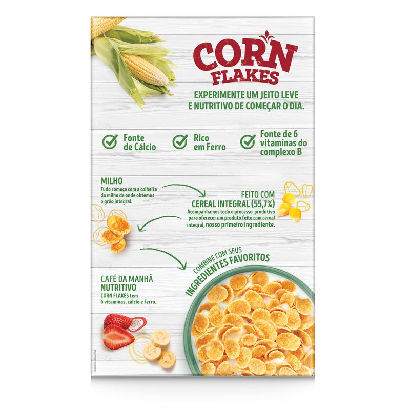 Feito com cereais integrais (55,7%), fonte de cálcio, rico em ferro e fonte de 6 vitaminas do complexo B, com NESTLÉ® CORN FLAKES experimente um jeito leve e nutritivo de começar o dia. Tudo começa com a colheita do milho de onde obtemos o grão integral, acompanhamos todo o processo produtivo para oferecer um produto feito com cereal integral (nosso primeiro ingrediente) para um café da manhã nutritivo - combine com seus ingredientes favoritos.