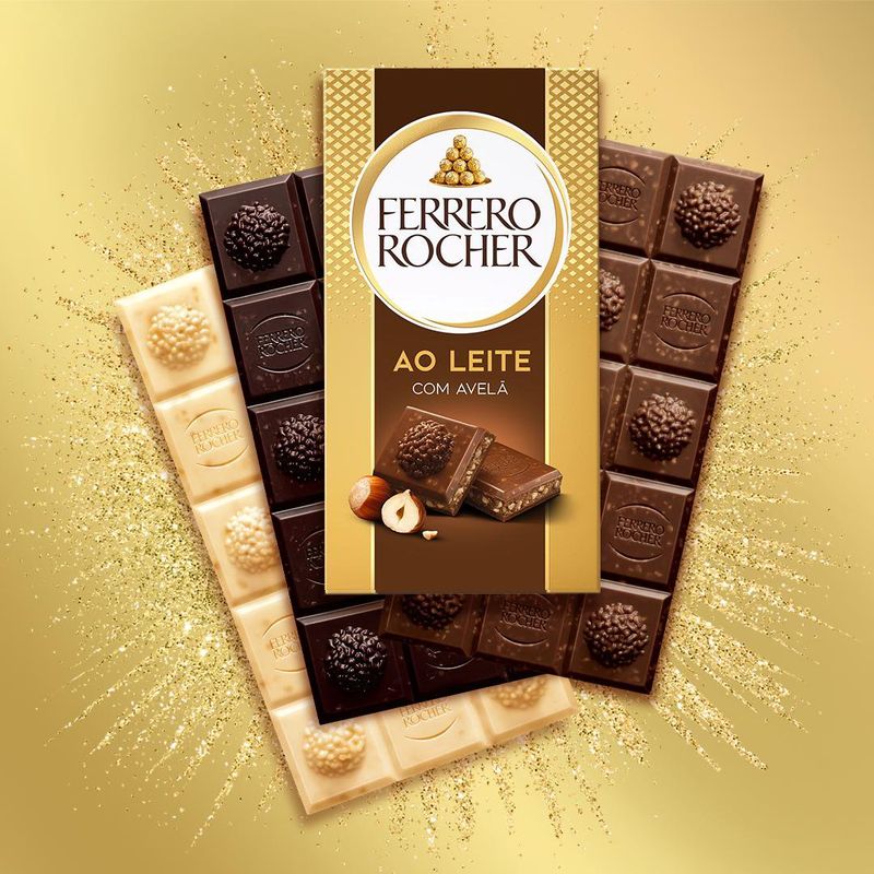 Descubra Ferrero Rocher Tablete Ao Leite: Chocolate ao leite com recheio de avelãs e cacau. O prazer em se surpreender!