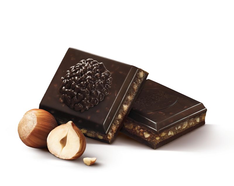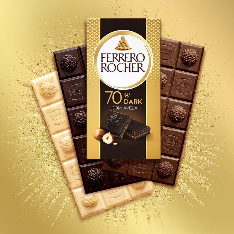 Descubra Ferrero Rocher Tablete Dark: Chocolate amargo com recheio de avelãs e cacau. O prazer em se surpreender!