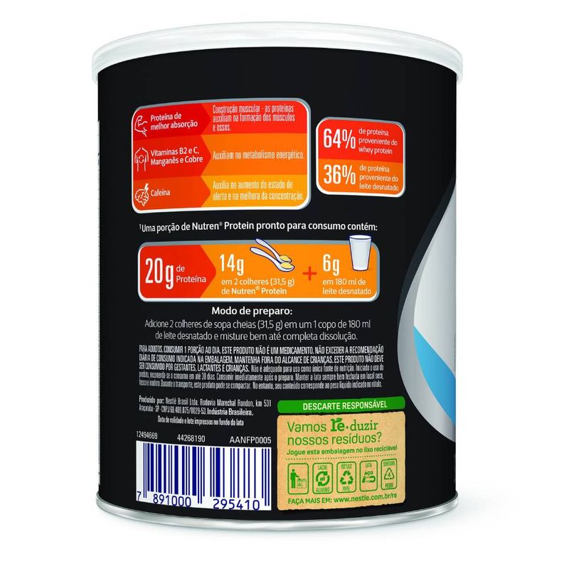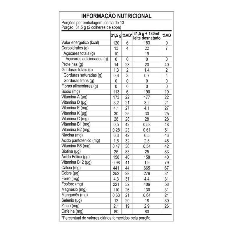 Suplemento alimentar em pó com Whey Protein, Cafeína e 20 vitaminas e minerais. Em uma porção de 31,5g preparado em 180 ml de leite desnatado oferece 20g de Proteína.