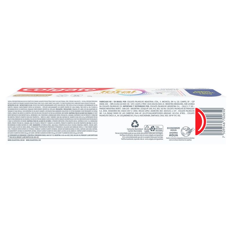 Colgate Total Original Mint, com prevenção ativa, é a escolha ideal para quem busca o melhor pasta de dente que combate a causa raiz dos problemas bucais***, antes que apareçam. O creme dental Colgate Total oferece 24 horas de proteção antibacteriana** e refrescância. Esta pasta de dente combate as bactérias que são a causa raiz de mau hálito, cáries, placa, tártaro e erosão do esmalte. O creme dental anticárie com flúor ajuda a limpar lugares difíceis de alcançar*. Seu uso regular ajuda a prevenir os problemas bucais mais comuns*** graças à sua fórmula com desempenho superior (em comparação a um creme dental normal com flúor sem ingrediente antibacteriano). A pasta Colgate Total tem prevenção de longa duração**, que ajuda a prevenir cáries e a fortalecer o esmalte. Para um cuidado ainda mais profundo, use Colgate Total Original Mint, prevenção ativa para uma limpeza profunda e proteção bucal completa. *vs apenas escovação. **Com escovação 2 vezes ao dia e uso contínuo durante 4 semanas. *** Ajuda a prevenir problemas bucais cosmeticos comuns causados por bacterias como: placa, cárie, tártaro e mau hálito.