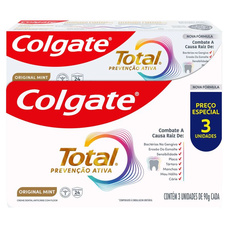 Colgate Total Original Mint, com prevenção ativa, é a escolha ideal para quem busca o melhor pasta de dente que combate a causa raiz dos problemas bucais***, antes que apareçam. O creme dental Colgate Total oferece 24 horas de proteção antibacteriana** e refrescância. Esta pasta de dente combate as bactérias que são a causa raiz de mau hálito, cáries, placa, tártaro e erosão do esmalte. O creme dental anticárie com flúor ajuda a limpar lugares difíceis de alcançar*. Seu uso regular ajuda a prevenir os problemas bucais mais comuns*** graças à sua fórmula com desempenho superior (em comparação a um creme dental normal com flúor sem ingrediente antibacteriano). A pasta Colgate Total tem prevenção de longa duração**, que ajuda a prevenir cáries e a fortalecer o esmalte. Para um cuidado ainda mais profundo, use Colgate Total Original Mint, prevenção ativa para uma limpeza profunda e proteção bucal completa. *vs apenas escovação. **Com escovação 2 vezes ao dia e uso contínuo durante 4 semanas. *** Ajuda a prevenir problemas bucais cosmeticos comuns causados por bacterias como: placa, cárie, tártaro e mau hálito.