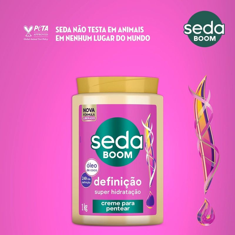 A vida é cheia de possibilidades - tenha um cabelo incrível para todas elas. Está pronta para conhecer a Nova Geração Seda Boom? O Creme para Pentear Seda Boom Definição Super Hidratação possui nova tampa e rótulo alinhados à família Boom, mas o mesmo resultado na finalização. Este creme para cabelos cacheados une a tecnologia Fitagem Complex com o poder do Óleo de Coco para deixar seus cachos definidos e hidratados. A nova fórmula contém Óleo de Coco, com nutri keratin, para definir a sua curvatura por 24h e entregar super hidratação para seus cabelos*, como ele merece! Esse creme para pentear é liberado, possui filtro UV em sua composição e garante 72h da mesma fragrância já amada pelas nossas consumidoras. Na nova Linha Seda Boom, você escolhe seu creme para pentear de acordo com a finalização que deseja, afinal, seja seus cabelos crespos, cacheados ou ondulados, você é livre para se expressar como quiser. Para cabelos cacheados definidos, siga a dica de finalização: Fitagem. Pronta? Com o cabelo úmido, separe-o em partes. Você pode usar um borrifador; passe o creme de pentear Seda Boom Definição mecha por mecha, usando os dedos como estivesse penteando os cabelos, de cima para baixo (evite muito creme na raiz!); amasse as mechas de baixo para cima, ajudando na formação dos cachos. Para resultados mais incríveis, use toda a linha Seda Boom: Shampoo, Condicionador e Máscara de Tratamento. Seda possui a certificação Cruelty-Free da PETA, o que significa que não testa seus produtos em animais. #JuntasArrasamos cacheando como quisermos, com fios mais lindos e hidratados. *Com o uso do Creme para Pentear Seda Boom Definição, comparado com shampoo sem agentes condicionantes.