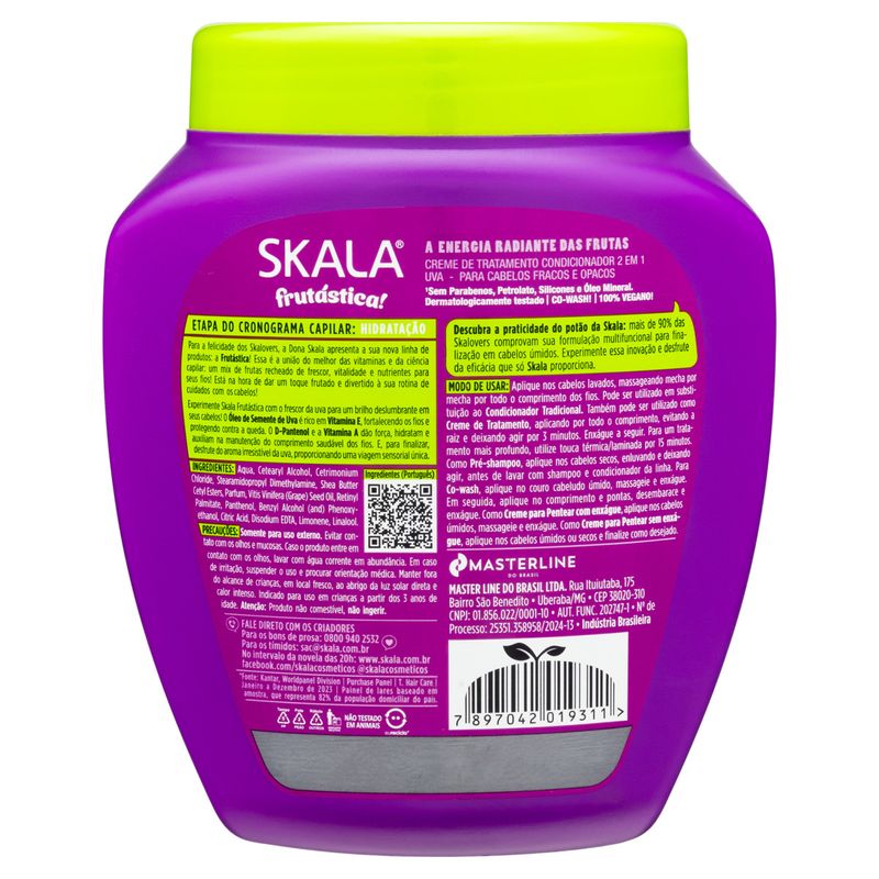 O Creme de Tratamento Capilar Skala é a escolha ideal para quem busca revitalizar e hidratar os cabelos de forma eficaz. Com uma fórmula enriquecida com extrato de uva, este produto proporciona uma nutrição intensa, deixando os fios macios e saudáveis. Ideal para todos os tipos de cabelo, ele atua profundamente, restaurando a umidade e a vitalidade dos fios.