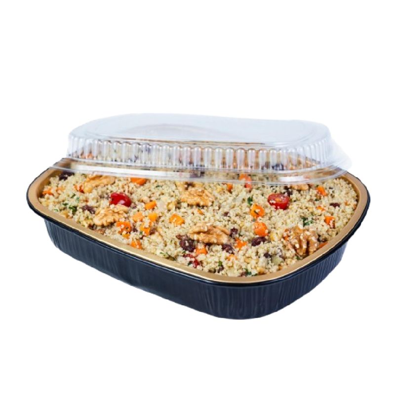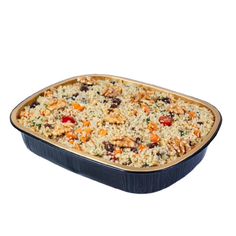 O Cuscuz Marroquino de 1kg é uma excelente escolha para quem busca um prato leve e versátil na ceia de Natal. Ele é preparado com manteiga, azeite, alho e cebola, e ganha textura e sabor com a adição de cenoura em cubos, nozes, uva-passas e tomate cereja, finalizado com um toque de pimenta do reino.