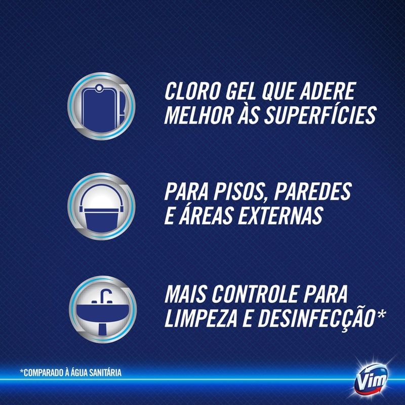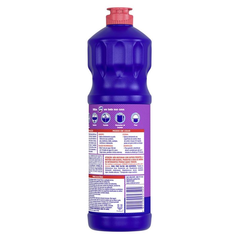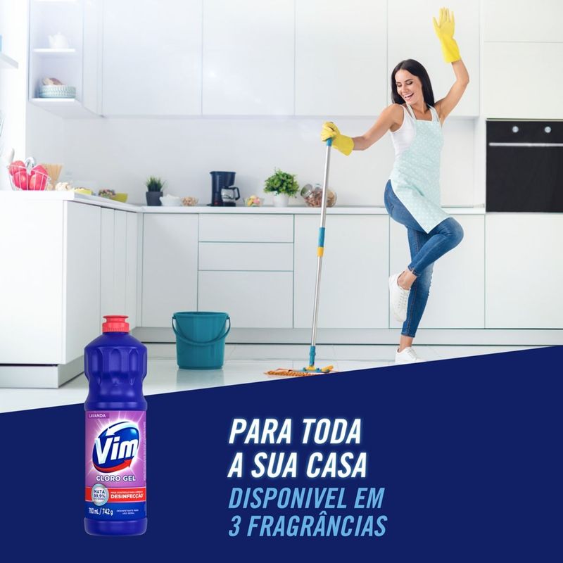 O Desinfetante Vim Cloro Gel Lavanda é um produto de limpeza que mata 99,9% dos germes* da sua casa. Vim Cloro Gel é a nova geração da água sanitária, pois é um cloro em gel e vai revolucionar sua limpeza do dia a dia. Ele limpa, desinfeta, alveja e é imbatível na exterminação de germes e sujeira de toda sua casa. Mata de imediato todos os tipos de germes (bactérias, fungos e vírus), inclusive aqueles que oferecem riscos de doenças, tendo assim mais controle para limpeza e desinfecção**. Ou seja, deixa sua casa e família mais protegidas. Por ser em gel, o Desinfetante Vim Cloro Gel Lavanda adere melhor às superfícies, inclusive as verticais, como rejuntes e azulejos; isto significa menos desperdício e mais economia para você. Vim adere e atua por mais tempo nas superfícies, resistindo até à corrente de água do vaso sanitário. O Desinfetante Vim Cloro Gel Lavanda conta com perfume que ajuda a reduzir o odor agressivo do cloro, característico das águas sanitárias. Ele pode ser usado em várias superfícies, como: vaso sanitário, lixeira, piso do banheiro, azulejo, pia da cozinha, rejuntes e ambientes que tenha constante contato com germes e bactérias. *Testado em Enterococcus hirae, Escherichia coli, Pseudomonas aeruginosa, Salmonella choleraesuis, Staphylococcus Aureus, Aspergillus niger, Candida albicans. **Comparado à água sanitária.
