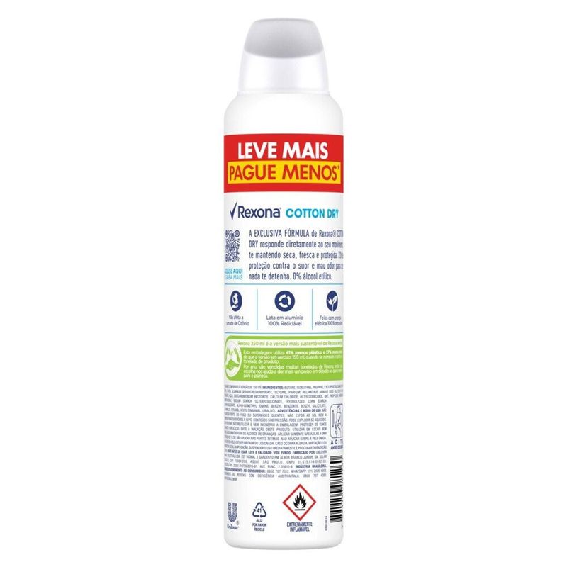 • O Desodorante Antitranspirante Aerosol Feminino Rexona Cotton Dry possui nova fórmula: 72 horas de proteção contra a transpiração e o mau odor, ativada pelo movimento • O novo desodorante feminino Rexona responde diretamente ao seu movimento, mantendo você seca, fresca e protegida como nunca • A fragrância do Desodorante Antitranspirante Aerosol Feminino Rexona Cotton Dry contém uma combinação única de notas verdes e florais, garantindo a sensação de frescor durante o dia inteiro • A fórmula do Antitranspirante Aerosol Feminino Rexona Cotton Dry é 0% álcool* e possui tecnologia MotionSense • Agite antes de usar. Aplicar o Desodorante Feminino Rexona Cotton Dry somente nas axilas a não menos de 15 cm da pele • Este desodorante antitranspirante não afeta a camada de ozônio, possui lata em alumínio 100% reciclável e é feito com energia elétrica 100% renovável Mais uma vez Rexona se supera e relança sua linha de desodorantes com uma fórmula inovadora, que combina um novo e exclusivo ativo antitranspirante com a tecnologia de fragrâncias encapsuladas. O resultado? O Desodorante Antitranspirante Aerosol Feminino Rexona Cotton Dry garante 72 horas de proteção ativada pelo seu movimento e muito mais confiança para você encarar qualquer desafio. Com o registro de 16 patentes e mais de 300 testes técnicos, está comprovado que essa nova tecnologia antitranspirante entrega um nível de proteção contra o suor como nenhuma outra proposta regular já entregou antes. A nova e exclusiva fórmula de Rexona Cotton Dry trabalha com um sistema de partículas menores e mais estáveis, que formam uma barreira protetora mais resistente e duradoura contra a transpiração e o mau odor, mantendo você seca, fresca e protegida a cada novo movimento e por muito mais tempo. Sua fragrância contém uma rica combinação de notas verdes e florais, garantindo a sensação de frescor durante o dia inteiro. Este desodorante feminino antitranspirante não afeta a camada de ozônio, possui lata em alumínio 100% reciclável e é feito com energia elétrica 100% renovável. Modo de usar: Agite antes de usar. Aplicar somente nas axilas a não menos de 15 cm da pele. Sua fórmula é 0% álcool* e possui tecnologia MotionSense. Além da nova fórmula, o novo formato de Rexona aerosol 250 ml é mais econômico, onde você leva mais produto e paga menos**. Ele é o formato mais sustentável de Rexona aerosol, com uma embalagem que utiliza 23% menos metal e 41% menos plástico do que a versão de aerosol 150 ml, quando se compara o gasto por tonelada de produto. Por ano, são vendidas muitas toneladas de Rexona aerosol, então essa escolha nos ajuda a dar mais um passo em direção ao que é melhor para o planeta. Por que Rexona não te abandona. *Não contém álcool etílico. **Quando comparado à versão de 150 ml