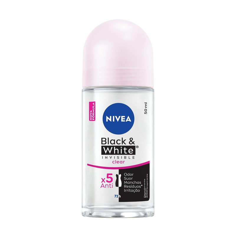 O que é? NIVEA Desodorante Roll-on Black & White INVISIBLE Clear é um desodorante roll-on que promove máxima proteção de NIVEA contra o suor, mau odor, manchas, resíduos nas roupas e irritação, além de proteger a pele. Deixa as axilas suaves e macias, é fácil de aplicar, e possui proteção dermatologicamente testada. Para que serve? NIVEA Desodorante Roll-on Black & White INVISIBLE Clear proporciona a melhor proteção contra manchas e suor. Sua fórmula é 5x anti odor, suor, manchas, resíduos nas roupas e irritação na pele, com proteção prolongada de 72 horas. Evita manchas brancas em roupas pretas e manchas amarelas em roupas brancas. Benefícios e diferenciais: Anti-manchas com proteção de 72 horas A melhor proteção contra manchas e suor Fácil de aplicar Dermatologicamente testado Cuidado suave