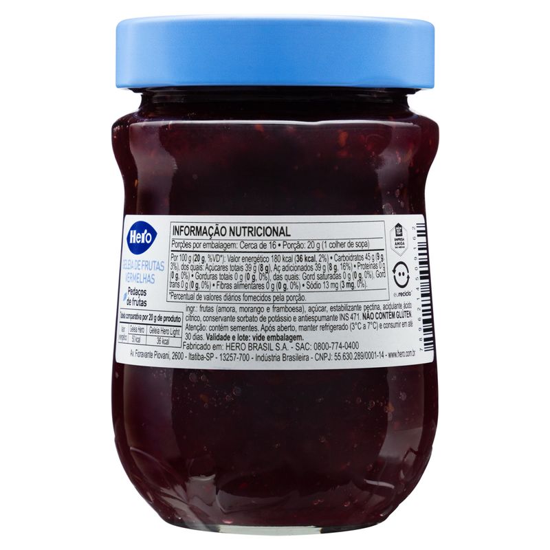 Cada porção de 15g contém uma quantidade reduzida de açúcar, tornando-a uma alternativa mais saudável em comparação às geleias tradicionais. É uma escolha consciente para quem deseja manter uma alimentação equilibrada sem abrir mão do sabor. A Geleia Hero Light VD é livre de conservantes artificiais, garantindo um produto mais natural e saudável para você e sua família.