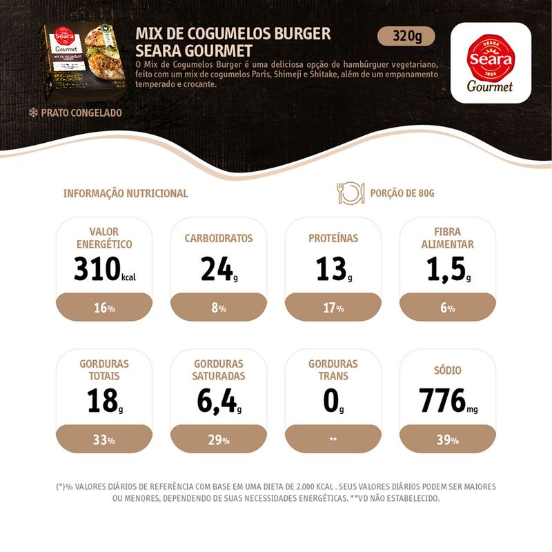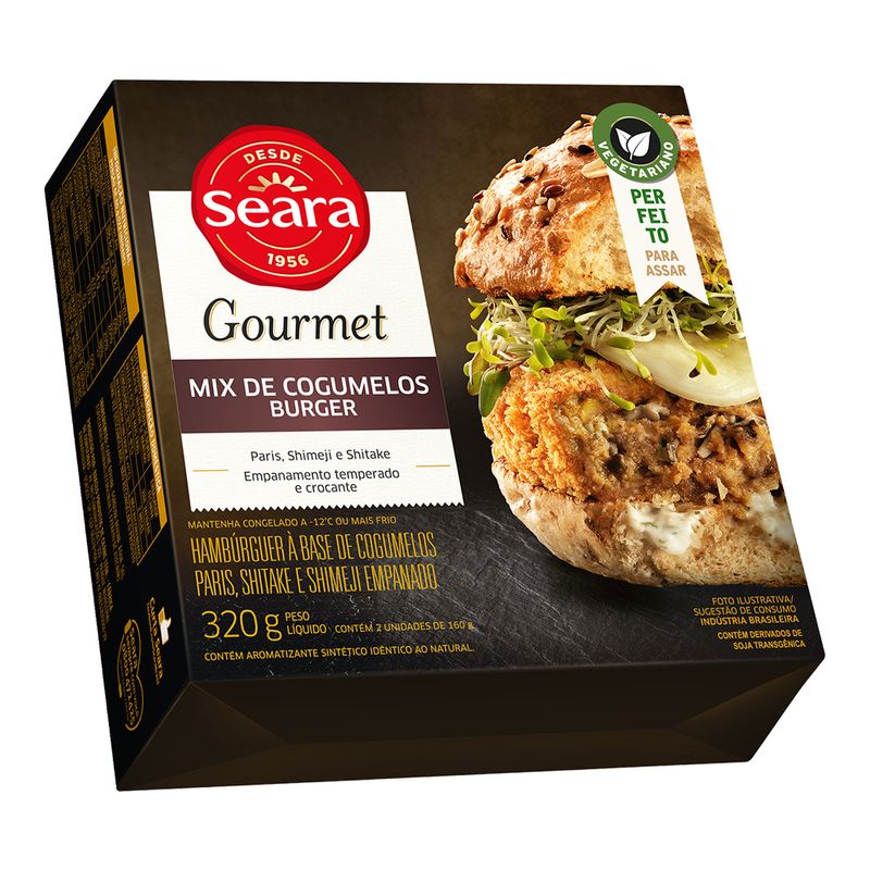 O Mix de Cogumelos Burguer Seara Gourmet é vegetariano, feito com um delicioso mix de cogumelos: shimeji, shiitake e paris. É quatro vezes mais alto e tem um toque de queijo que derrete ao assar.