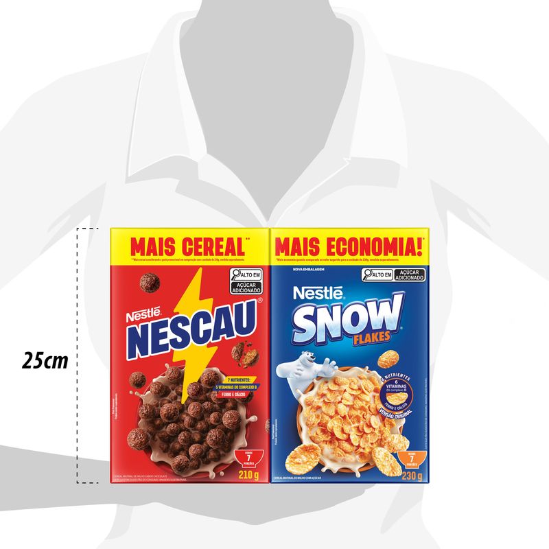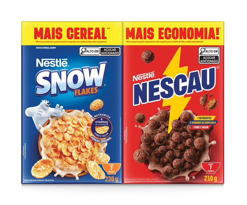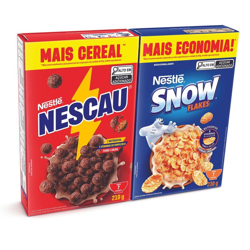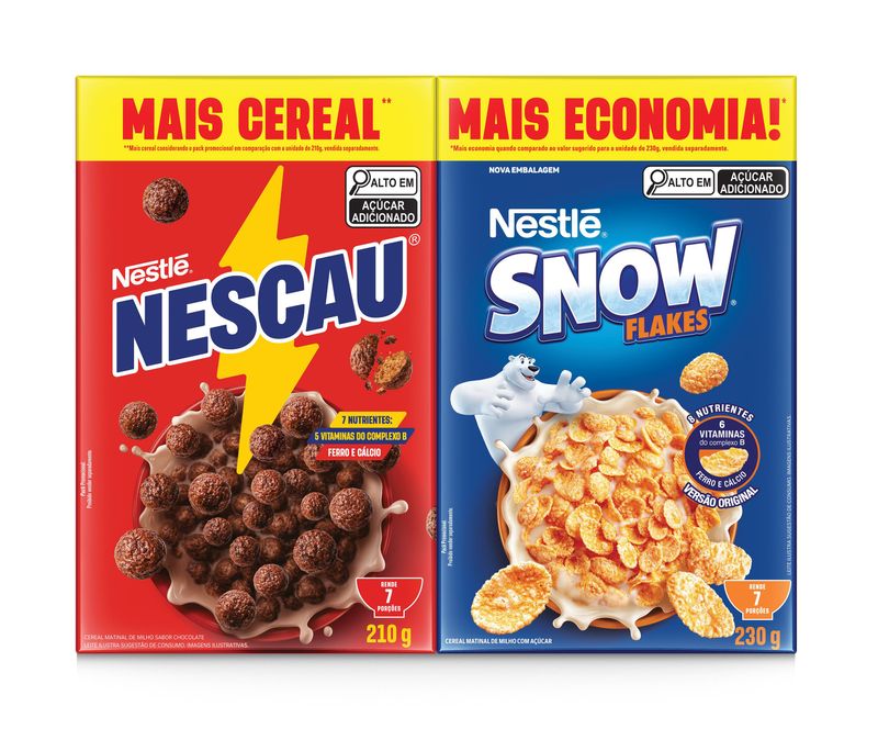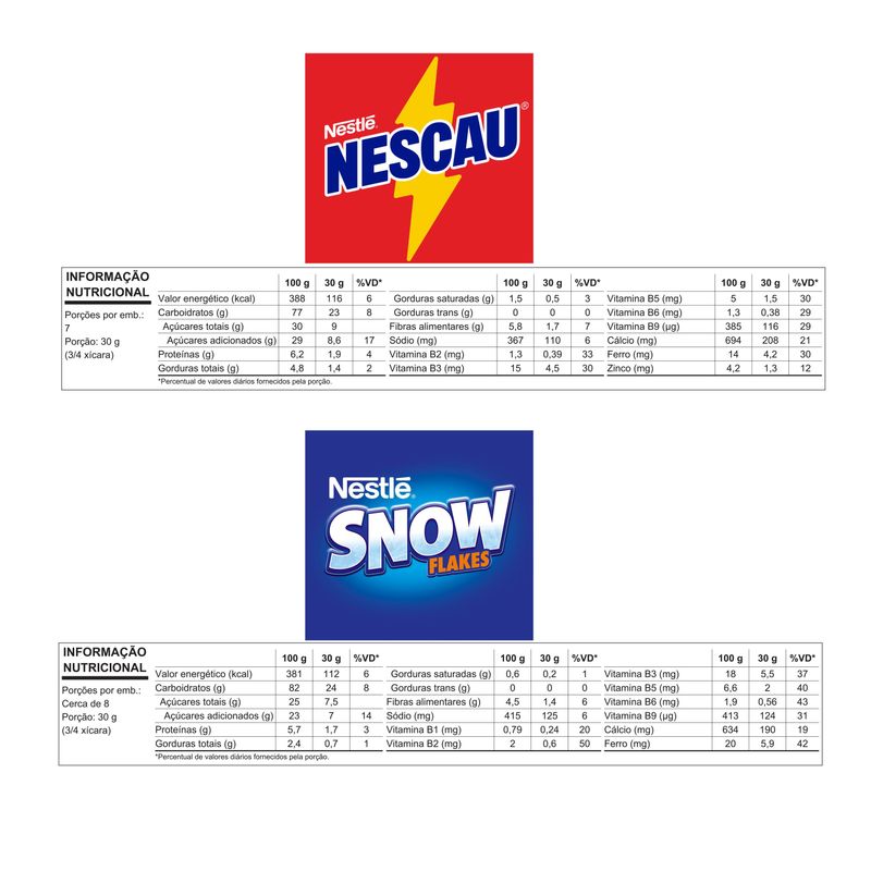 NESCAU CEREAL: Feito com Cereais Integrais (44,8%) que preservam todos os nutrientes do grão, NESTLÉ® NESCAU® CEREAL contém 7 nutrientes (vitaminas B2, B3, B5, B6, B9, ferro e cálcio) e é super crocante - energia que dá gosto de viver. SNOW FLAKES: Feito com Cereais Integrais (42,5%) que preservam todos os nutrientes do grão, NESTLÉ® SNOW FLAKES® contém 8 nutrientes (vitaminas B1, B2, B3, B5, B6, B9, ferro e cálcio) e sabor delicioso.