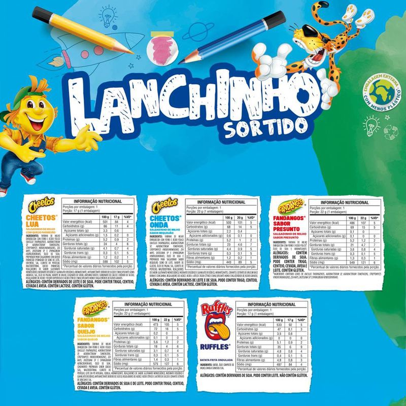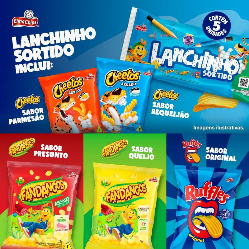 Se um salgadinho Elma Chips já é bom, imagine 5 em uma mesma embalagem! O Lanchinho da Elma Chips é um produto sortido que vem com os salgadinhos que você mais ama: Ruffles, Cheetos e Fandangos. Perfeito para o lanche das crianças. Delicioso e muito divertido!