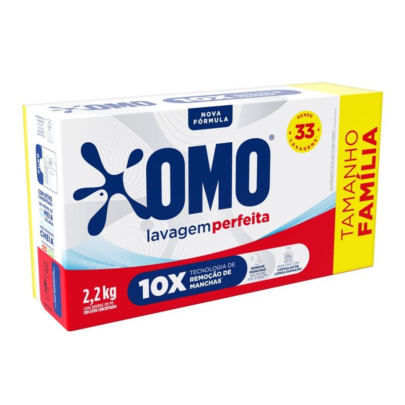 O Sabão em Pó OMO Lavagem Perfeita contém uma nova fórmula com Biotecnologia + Anti-Resíduos, garantindo máxima limpeza e zero danos de resíduos de sabão. Sua fórmula com pó ultrafino de rápida dissolução, remove as manchas de primeira, sem desgastar os tecidos e ainda cuida das cores pretas. Ele oferece muito poder e cuidado para as suas roupas e ainda a deixa perfumada por muito mais tempo. O lava roupas Lavagem Perfeita OMO cuida das suas roupas, da sua máquina e do meio ambiente. É imbatível na limpeza* e cuida do meio ambiente, pois sua fórmula contém ingredientes biodegradáveis, e não possui fosfato, ajudando a preservar rios e oceanos, além de economizar água**. Além disso, possui ativo concentrado, tecnologia que cuida do planeta. Menos CO2, menos poluição. É um lava-roupas sustentável e com rendimento eficiente, pois necessita de apenas um enxágue e permite lavar uma máquina cheia com apenas meia xícara***. Perfeito para manter suas roupas impecáveis e seu dia a dia super prático! Sua embalagem é 100% reciclável. Faça o descarte consciente. Nós sOMOs diferentes, limpeza imbatível, sem resíduo de sabão, cuidamos das roupas e cuidamos do meio ambiente. Quando você escolhe OMO, você escolhe um mundo melhor. Mantenha o produto fora do alcance de crianças e dos animais domésticos. Leia o rótulo antes de usar o produto. Para saber mais sobre a linha de produtos OMO, acesse o site. *Comparado a detergentes do mesmo fabricante. Remove manchas como suco de laranja, sobremesa de chocolate e óleo de fritura (tecido de algodão). **Reduzindo de 2 ou mais enxágues para apenas 1.***Xícara de chá de 240 ml. Máquina de abertura superior.