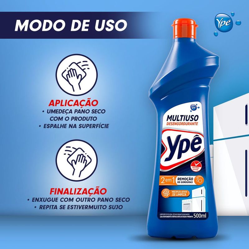 O Multiuso Ypê Premium 2 em 1 Clássico e um grande aliado para o seu dia a dia.Tem alto poder desengordurante e de limpeza para tirar as sujeiras mais difíceis. Indicado para: superfícies e pinturas laváveis, fogões, pias de cozinha, eletrodomésticos, mármores, granitos, pias de banheiro, pisos, azulejos e vidros (sem filme do tipo Insulfilm®).