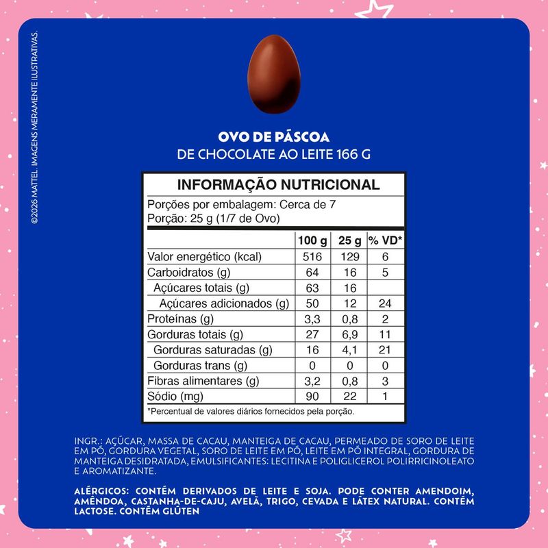 Presenteie com o Ovo de Páscoa Lacta ao Leite Barbie 166g. Um ovo de Páscoa com a cremosidade do chocolate ao leite Lacta e que vem com uma Barbie Bailarina sortida e saia customizável para brincar. Perfeito para aproveitar com toda a família, ou para presentear. Compre já! Tabela Nutricional e Alergênicos: Veja a tabela nutricional e ingredientes nas imagens. Produto com Alto Teor de Açúcar Adicionado e Gordura Saturada.