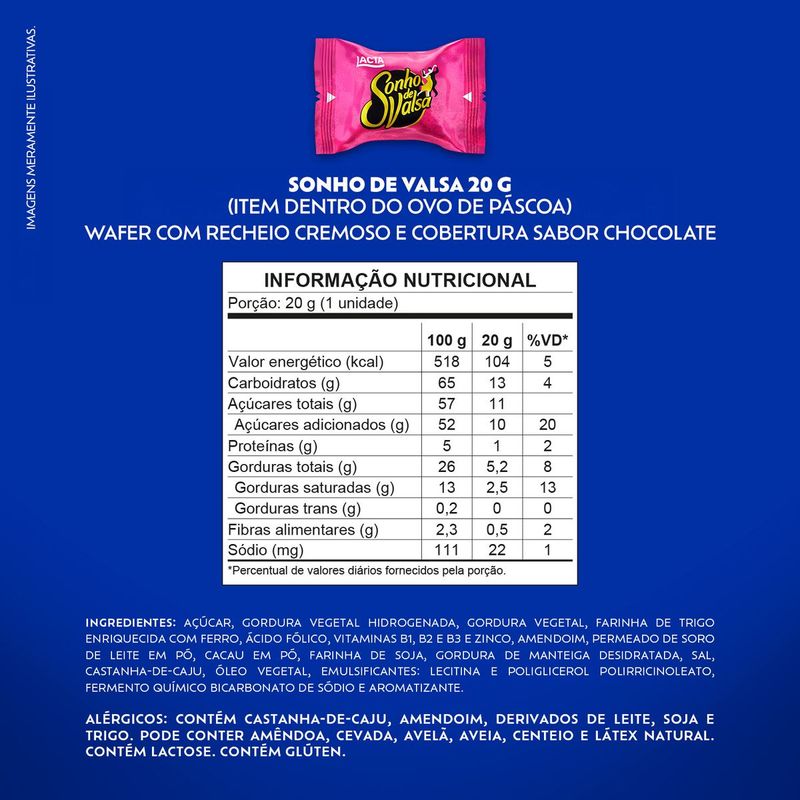 Compre agora o Ovo de Páscoa Lacta Sonho de Valsa 277g. É a combinação perfeita de um recheio cremoso de amendoim e castanha de caju, com a crocância do wafer e sua deliciosa camada sabor chocolate. Perfeito para aproveitar com toda a família, ou para presentear parentes e amigos. Compre já! Embalagem individual 277g. Tabela Nutricional e Alergênicos: Veja a tabela nutricional e ingredientes nas imagens. Produto com Alto Teor de Açúcar Adicionado e Gordura Saturada.