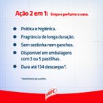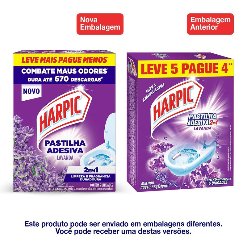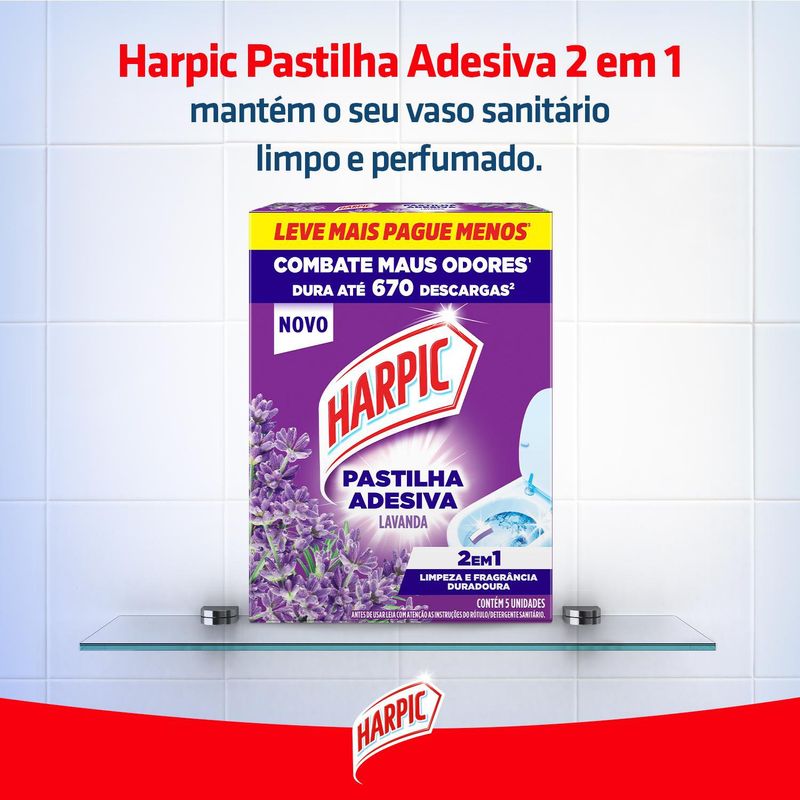 Harpic Pastilha Adesiva Sanitária 2 em 1 oferece manutenção da limpeza do vaso sanitário com um agradável perfume de longa duração por até 400 descargas por caixa². Discreto, dispensa o uso de cestinhas e ganchos, e mantém o vaso sempre apresentável e limpo. ¹Rendimento de até 134 descargas por pastilha.