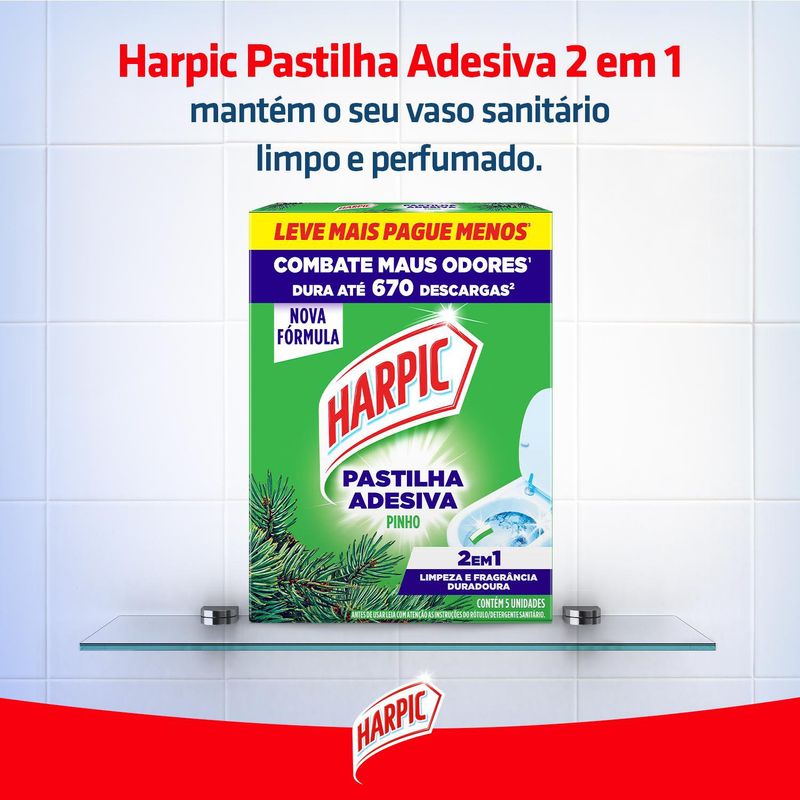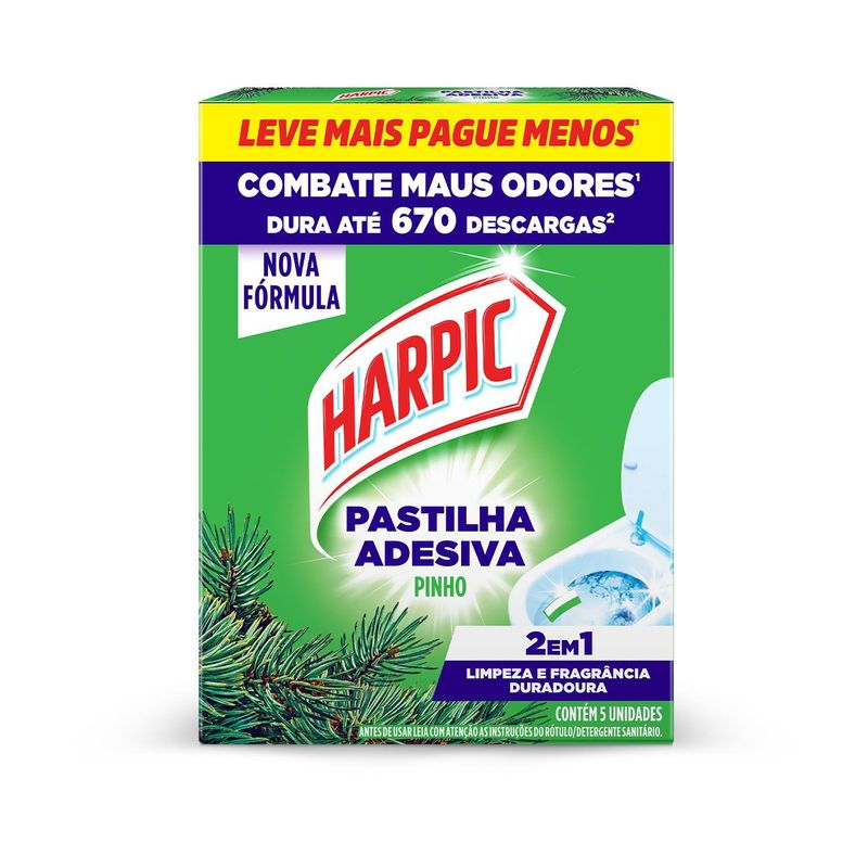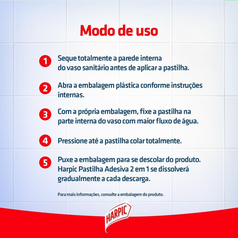 Harpic Pastilha Adesiva Sanitária 2 em 1 oferece manutenção da limpeza do vaso sanitário com um agradável perfume de longa duração por até 400 descargas por caixa². Discreto, dispensa o uso de cestinhas e ganchos, e mantém o vaso sempre apresentável e limpo. ¹Rendimento de até 134 descargas por pastilha.