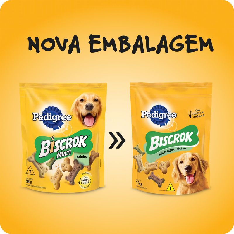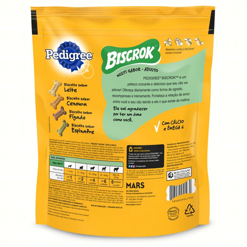 O petisco Pedigree Biscrok Multi sabores Pouch 500g é uma opção saborosa e nutritiva para recompensar seu cão de forma segura e equilibrada. Desenvolvido especialmente para cães adultos de todos os portes, o produto reúne uma combinação de quatro sabores deliciosos em um só pacote: leite, cenoura, fígado e espinafre. Com textura crocante, o Pedigree Biscrok ajuda a manter a saúde bucal do animal, auxiliando na limpeza dos dentes e na prevenção do acúmulo de tártaro. Sua fórmula é enriquecida com cálcio e fósforo, que fortalecem os ossos e dentes, além de conter ômega 3 e 6, importantes para a saúde da pele e o brilho da pelagem. O produto também oferece um mix equilibrado de vitaminas e minerais essenciais que contribuem para o bem-estar geral do cão. Sem corantes artificiais, esse petisco é uma opção mais natural e segura para o consumo diário. Pode ser oferecido como mimo, estímulo em treinamentos ou reforço positivo. A embalagem tem orientações claras sobre a quantidade ideal conforme o peso do animal, sempre com a recomendação de acompanhamento veterinário.