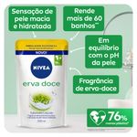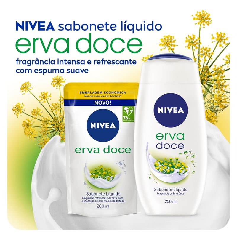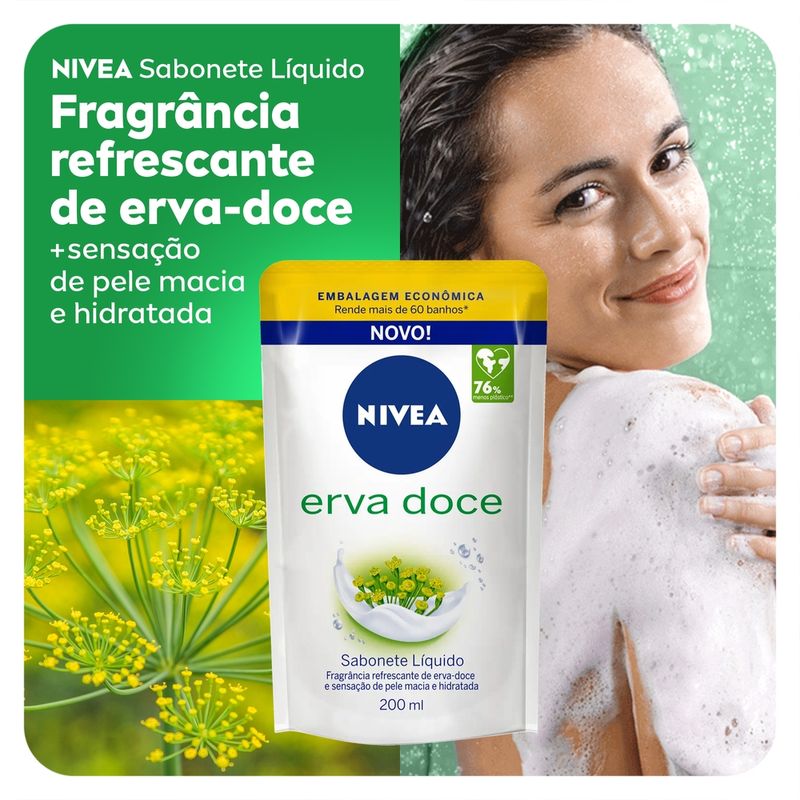 O que é? NIVEA Sabonete Líquido Erva Doce Refil é um produto de cuidado diário para a pele, que limpa e hidrata profundamente, deixando-a com uma fragrância refrescante de Erva Doce. Para que serve? Além de limpar e hidratar, ele equilibra o pH da pele, deixando-a saudável e revitalizada. NIVEA Sabonete Líquido Erva Doce Refil é ideal para todos os tipos de pele, sendo recomendado para uso diário. Dermatologicamente testado, este sabonete possui uma fragrância duradoura de erva-doce que proporciona uma experiência sensorial única durante o banho. Ele também possui uma espuma cremosa com toque refrescante que garante um cuidado eficaz e a sensação de pele macia e limpa. Benefícios e diferenciais: - Fragrância refrescante e duradoura de erva-doce - Equilibra o pH da pele - Rende mais de 60 banhos - Reduz 76% de plástico - Refrescante e com espuma cremosa - Proporciona uma experiência sensorial única durante o banho - Deixa a pele macia e limpa