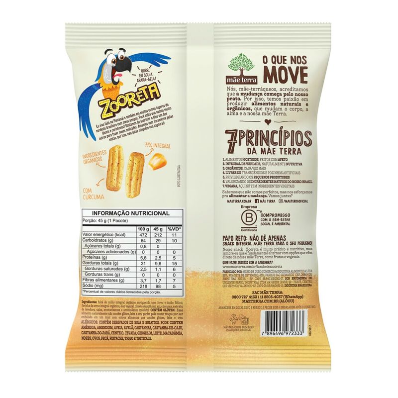 • O Salgadinho Orgânico Infantil Mãe Terra Zooreta Milho é um snack saudável que alegra o lanchinho das crianças • Feito com milho e arroz integrais e orgânicos, o Salgadinho Mãe Terra Zooreta contém somente ingredientes naturais e é livre de pozinhos artificiais, perfeito para snacks saudáveis • O Salgadinho Mãe Terra Zooreta Milho é 100% vegano, 77% integral, com cúrcuma e livre de transgênicos • Com um delicioso sabor de milho verde, e com seu formato de rolinho, este snack orgânico é uma forma saudável e divertida de saciar a barriguinha dos pequenos • O Salgadinho Mãe Terra Zooreta Milho é uma excelente opção para colocar na lancheira das crianças e muito prático para levar em passeios ou viagens, garantindo uma alimentação saudável e deliciosa • Nós, mãe-terráqueos, acreditamos que a mudança começa pelo nosso prato. Por isso, temos paixão em produzir alimentos naturais, saudáveis e orgânicos que mudam o corpo, a alma e a nossa mãe Terra É possível existir um snack saudável para crianças que seja integral, assado, não conter pozinhos artificiais e ainda ser delicioso? Sim, é possível! Exatamente assim é o nosso Salgadinho Orgânico Infantil Mãe Terra Zooreta Milho, um snack vegano e divertido que mantém o sabor e a crocância que a gente adora, além de ser uma opção saudável para o corpo e alma. Este snack com sabor de milho verde é 100% vegano, 77% integral, com cúrcuma e livre de transgênicos, para uma alimentação saudável. O Salgadinho Mãe Terra Zooreta é uma excelente opção para acompanhar as crianças e toda família nas aventuras do dia a dia. Fundada em 1979, a Mãe Terra é líder no segmento de alimentos naturais e orgânicos no Brasil. E é com muita alegria que podemos dizer que somos uma Empresa B, comunidade global de organizações que buscam o desenvolvimento socioambiental, além de econômico. Temos o desafio de crescer, mas sempre respeitando os limites da natureza, valorizando a preservação ambiental e com cuidado social. Ser parte desse movimento nos mostra que estamos no caminho certo. Afinal, tem que valer a pena levantar cedo. Nós, mãe-terráqueos, acreditamos que a mudança começa pelo nosso prato. Por isso, temos paixão em produzir alimentos naturais e orgânicos que mudam o corpo, a alma e a nossa mãe Terra. Os 7 princípios da Mãe Terra são: 1. Alimentos gostosos, feitos com afeto; 2. Integral de verdade, naturalmente nutritiva; 3. Orgânicos, cada vez mais; 4. Livres de transgênicos e pozinhos artificiais; 5. Privilegiando os pequenos produtores; 6. Valorizando os ingredientes nativos do nosso Brasil; 7. Vegana, aqui só tem ingredientes vegetais. Sabemos que não somos perfeitos, mas nos esforçamos para fazer nossa parte. Vamos juntos? #AlimenteaMudança