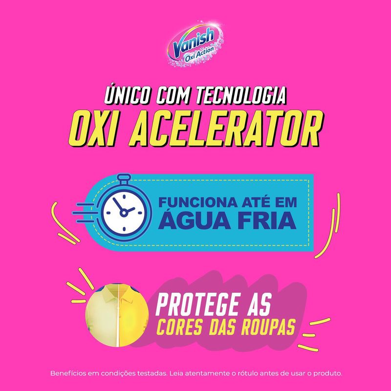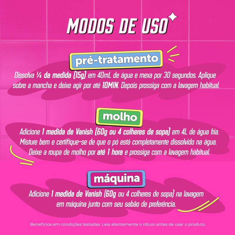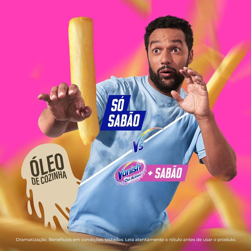 Vanish Oxi Action é o potencializador de lavagem em pó, sem cloro, que higieniza, tira manchas,neutraliza odores das roupas coloridas, sem esforço. Fórmula com poder Oxi previne a transferência de cores e limpa profundamente suas roupas coloridas.