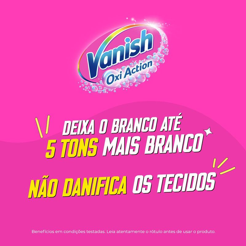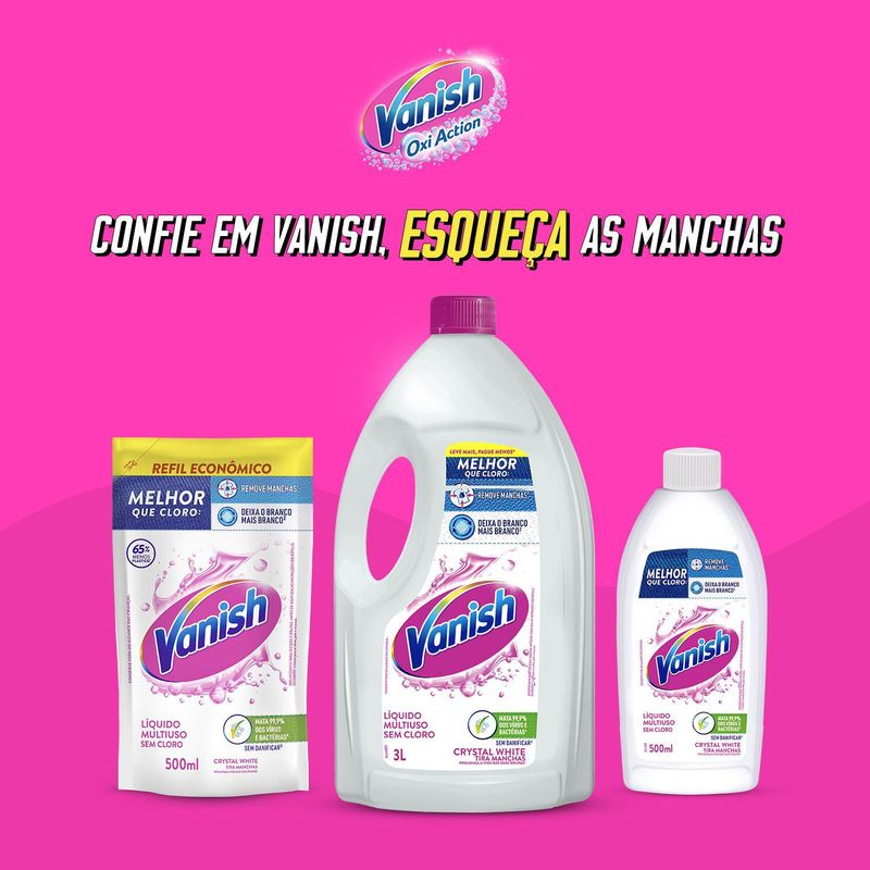 Vanish Líquido Crystal White é o tira manchas melhor cloro. Ele remove manchas das roupasbrancas e deixa o branco mais branco, sem esforço. Sua fórmula mata 99,9% de vírus e bactérias e combate o amarelado. Roupas brancas como novas!