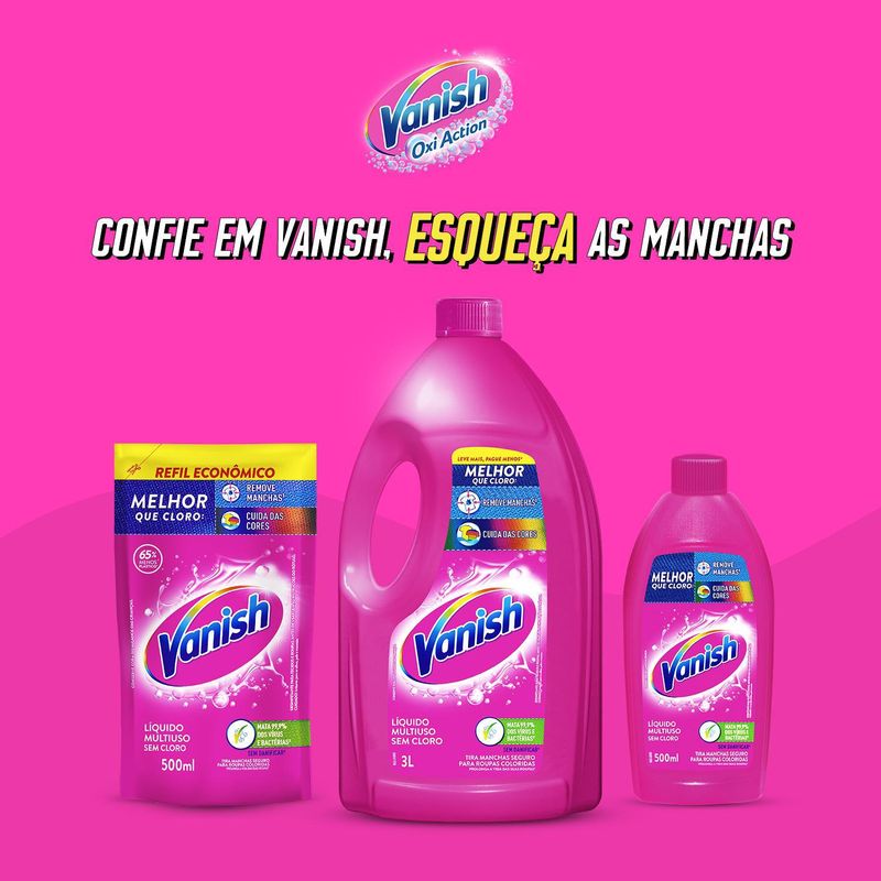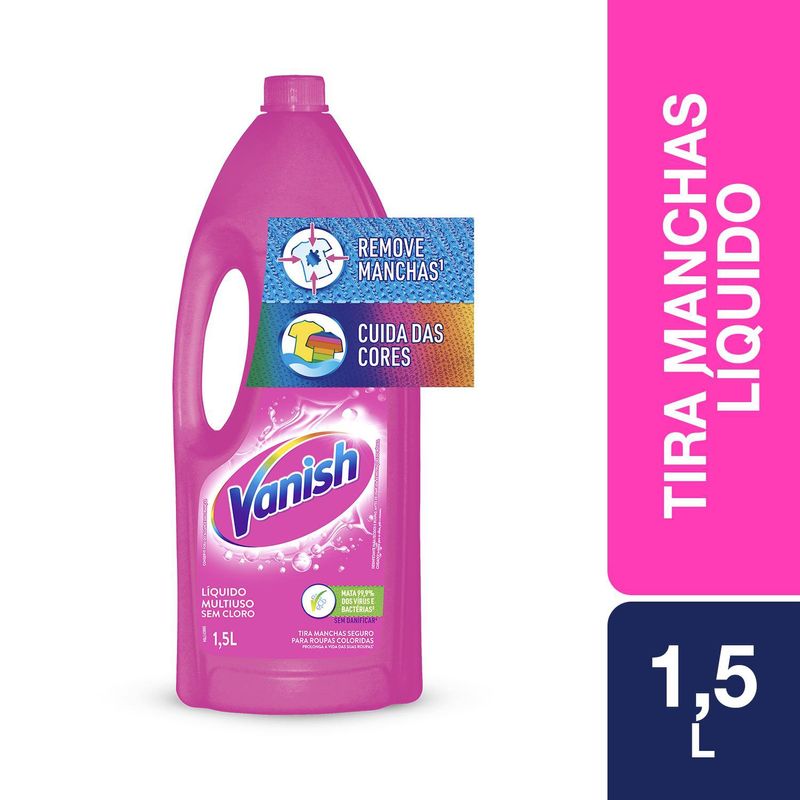 Vanish Líquido Multiuso é o tira manchas melhor que cloro. Ele remove manchas difíceis e cuidadas cores das roupas coloridas, sem esforço. Ele mata 99,9% de vírus e bactérias, mantém as cores vivas, deixando as roupas como novas por mais tempo. Compre já!