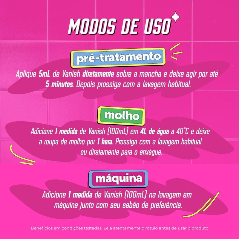 Vanish Líquido Multiuso é o tira manchas melhor que cloro. Ele remove manchas difíceis e cuidadas cores das roupas coloridas, sem esforço. Ele mata 99,9% de vírus e bactérias, mantém as cores vivas, deixando as roupas como novas por mais tempo. Compre já!